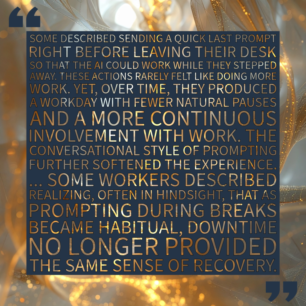 This month’s riffing comes courtesy of Harvard Business Review’s recent article, AI doesn’t reduce work, it intensifies it by Aruna Ranganathan and Xingqi Maggie Ye. They say organizations are getting more productivity from a lot of tasks assisted by AI, like drafting, summarizing, debugging code. These projects might succeed, but they’re really just availing employees with more tasks and less specialty and to the point the workers never feel like they can really take a break from their work.